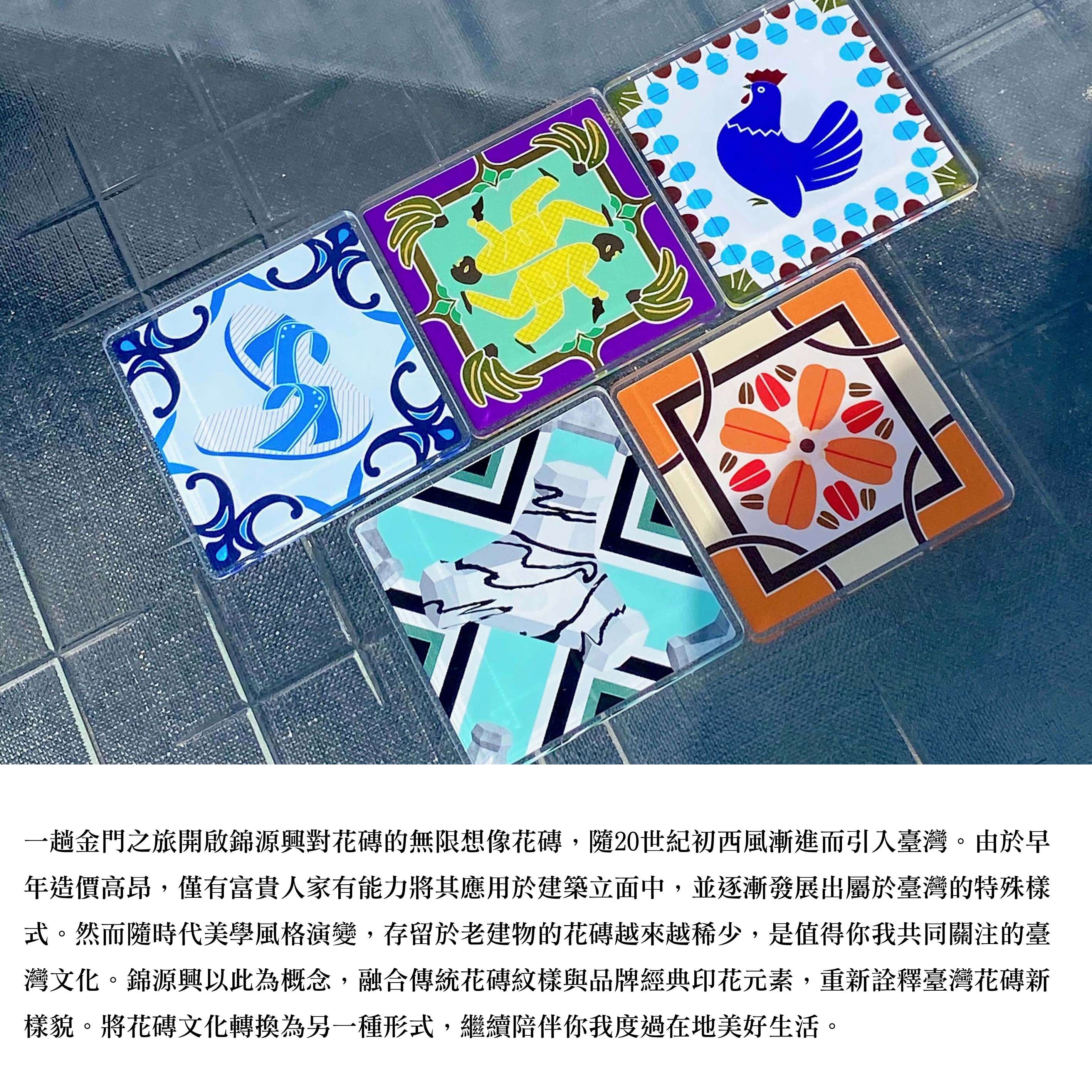 翻玩錦源興經典印花與臺灣花磚元素,可作冰箱磁鐵或擺飾使用。