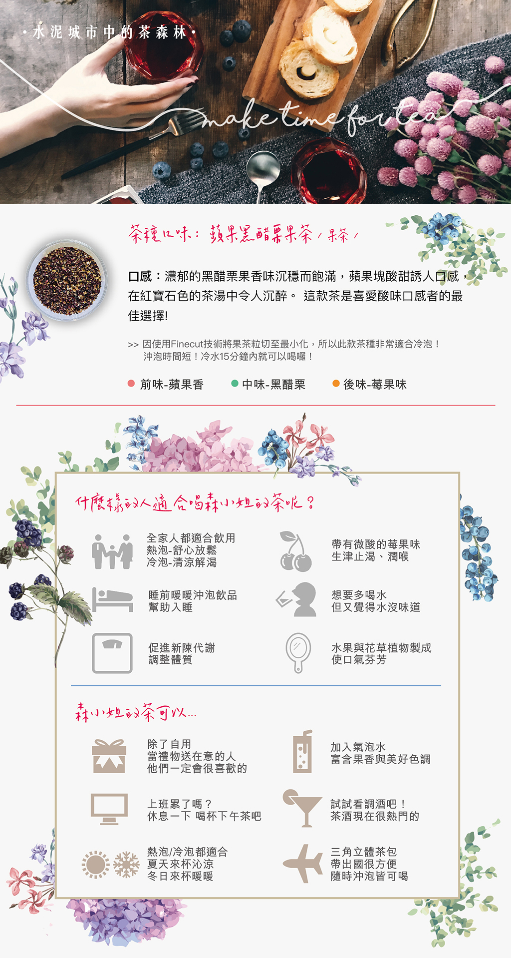 濃郁的黑醋栗果香味沉穩而飽滿,蘋果塊酸甜誘人口感, 在紅寶石色的茶湯中令人沉醉。 這款茶是喜愛酸味口感者的最佳選擇!